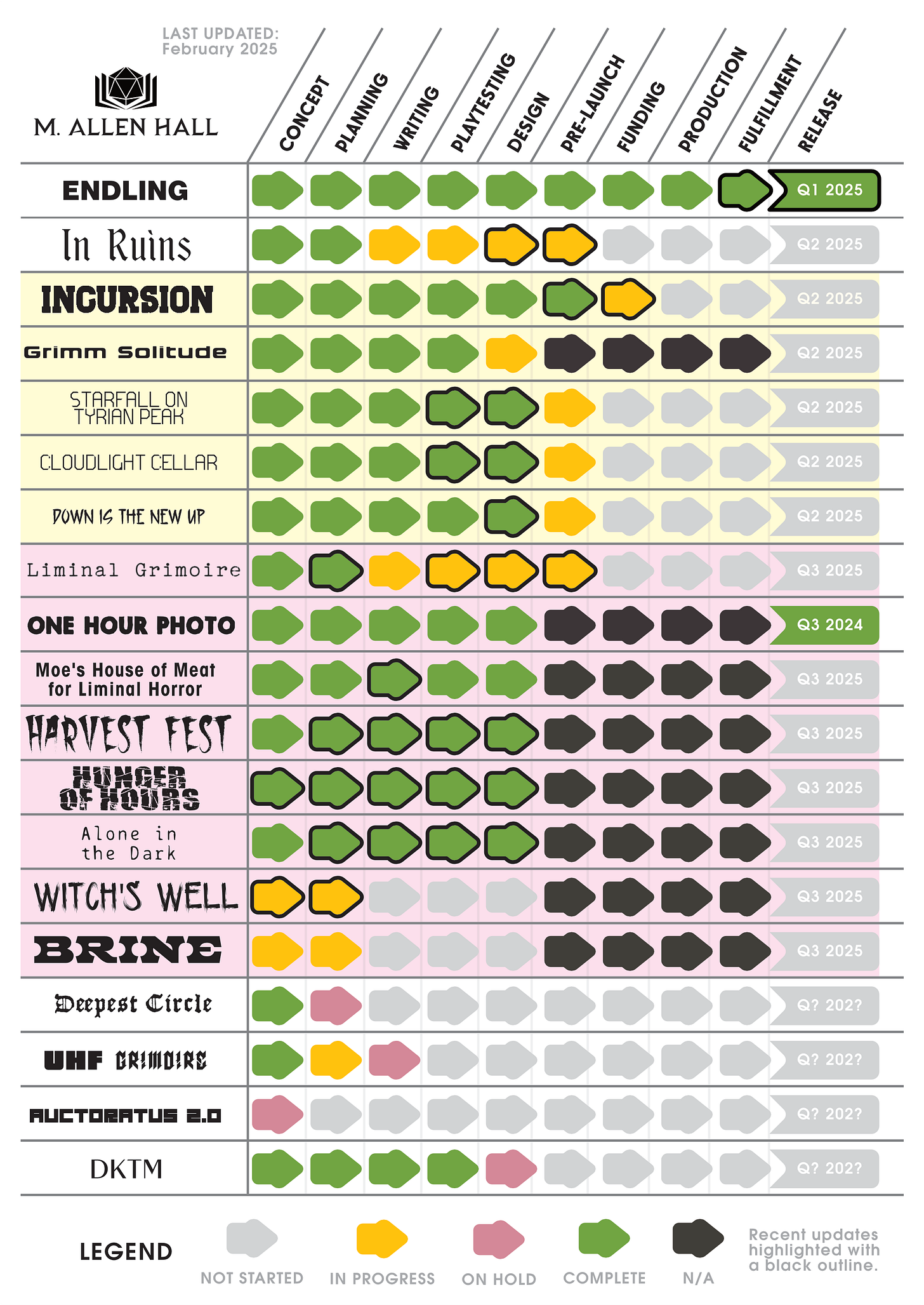 Since last month, I’ve made good progress on In Ruins, and layout work is starting soon. Liminal Grimoire is coming along well, with 5 pamphlets completely done. I am aiming for 6-8 in the complete set. Oh yeah, and Endling has finished fulfillment!