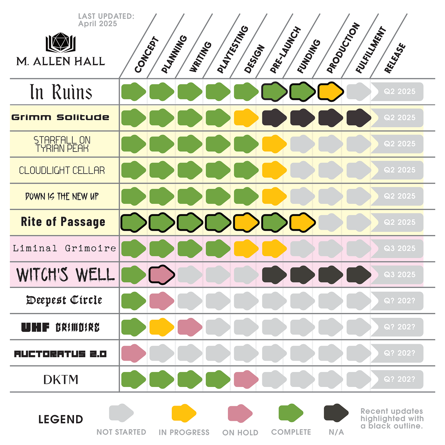 I took out some of the Liminal Grimoire titles. Those are still very much alive, but they were taking up too much space on the grid. Only Witch’s Well remains, On Hold until it is (hopefully) unlocked as a stretch goal of the Liminal Grimoire BackerKit campaign, which launches April 15!